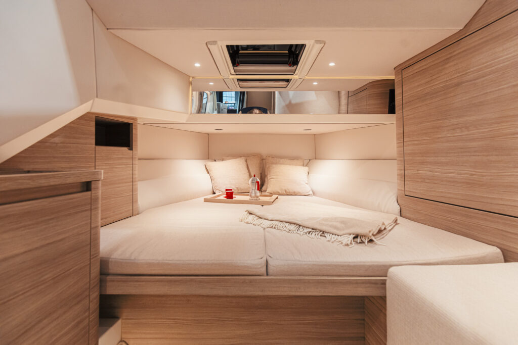 Une cabine avant est associée à une nouvelle cabine centrale double. Une salle de bain avec douche séparée complète l’aménagement. Avec la cabine arrière en option, la configuration passe à trois cabines.